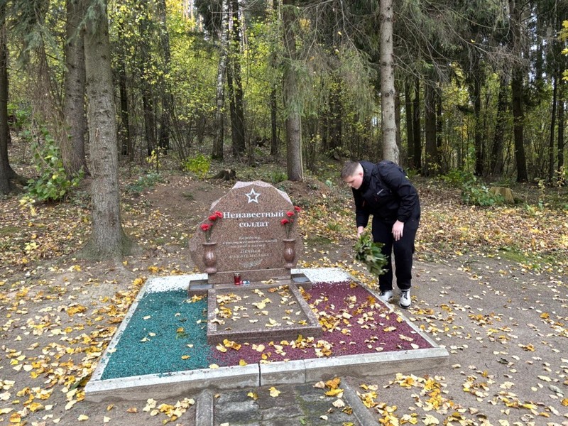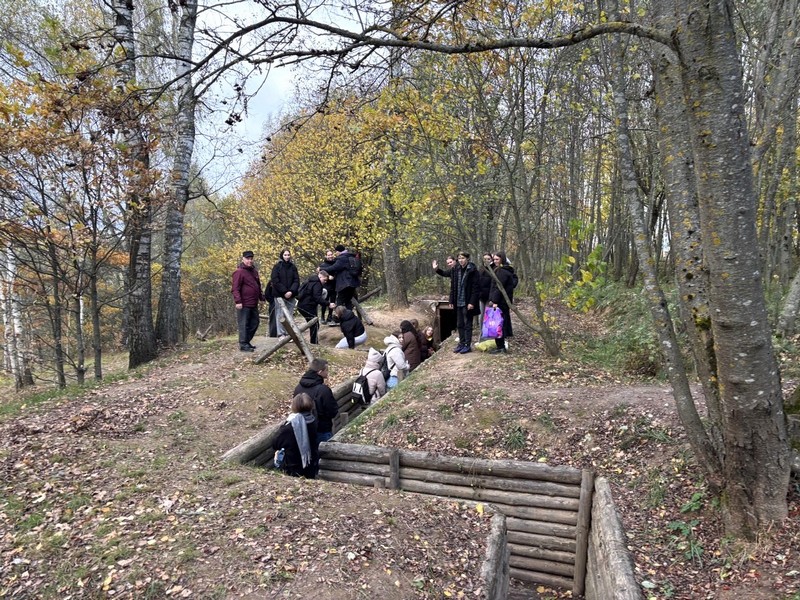 Маршрут проходил по живописному осеннему лесу, густо пересеченному оврагами и пригорками. Первая остановка – лесное озеро у крутого обрыва. Поражает открывающаяся перспектива на окрестные деревни, леса и поля. Далее лесная тропинка привела к могиле неизвестного солдата. Учащиеся провели уборку захоронения и почтили память погибших воинов минутой молчания.
