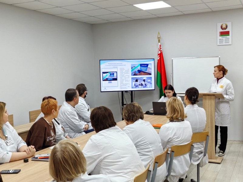 Во время проведения теоретической части занятия специалисты лаборатории по отработке навыков методист Вайлунова Инесса Александровна и лаборант Дривило Диана Игоревна ознакомили участников мероприятия с классификацией средств симуляционного обучения, уровнями их реалистичности, особое внимание уделили методической и организационной подготовке практического занятия с использованием симуляционного оборудования.