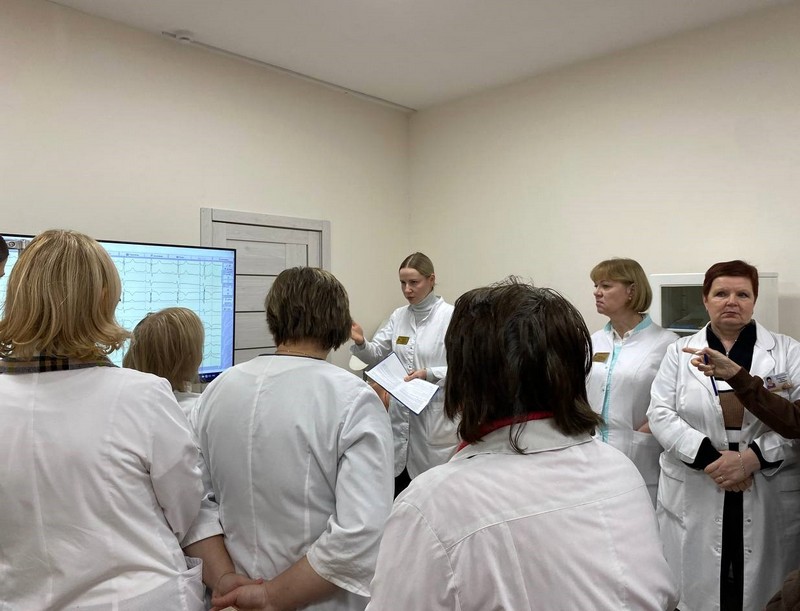 Преподаватели смогли познакомиться с работой фантомов и тренажеров, манекенов-тренажеров с электронным и программным контроллером, а также была продемонстрирована работа 12-канального цифрового компьютерного электрокардиографа «Интекард-3» для регистрации и расшифровки электрокардиограмм.
