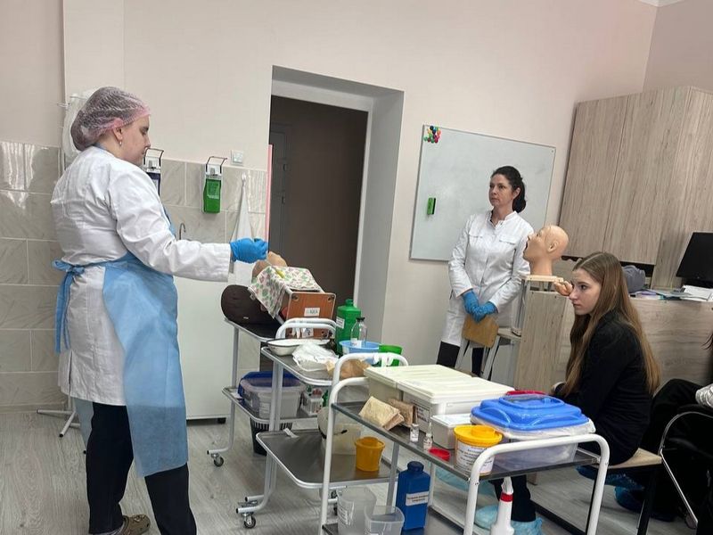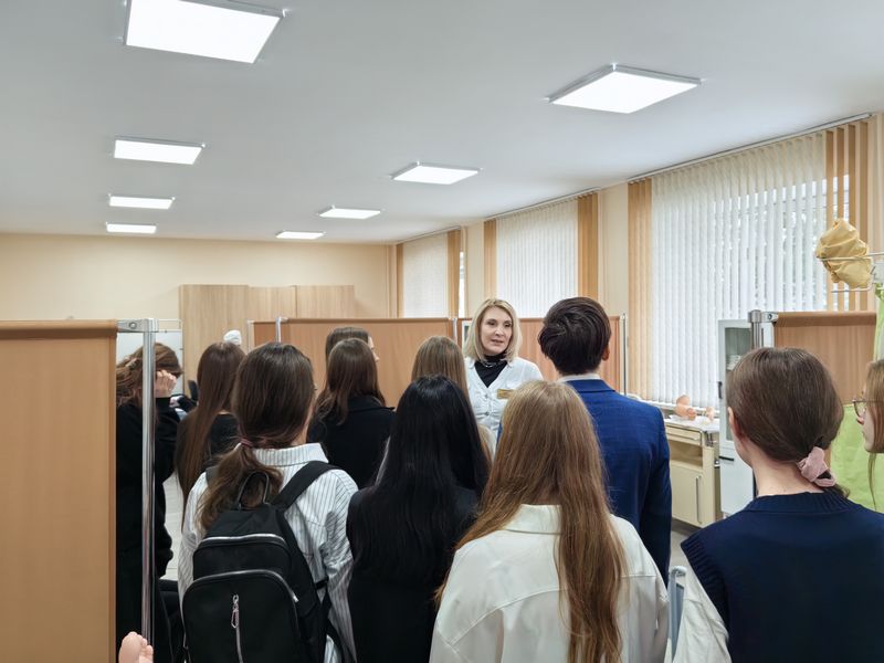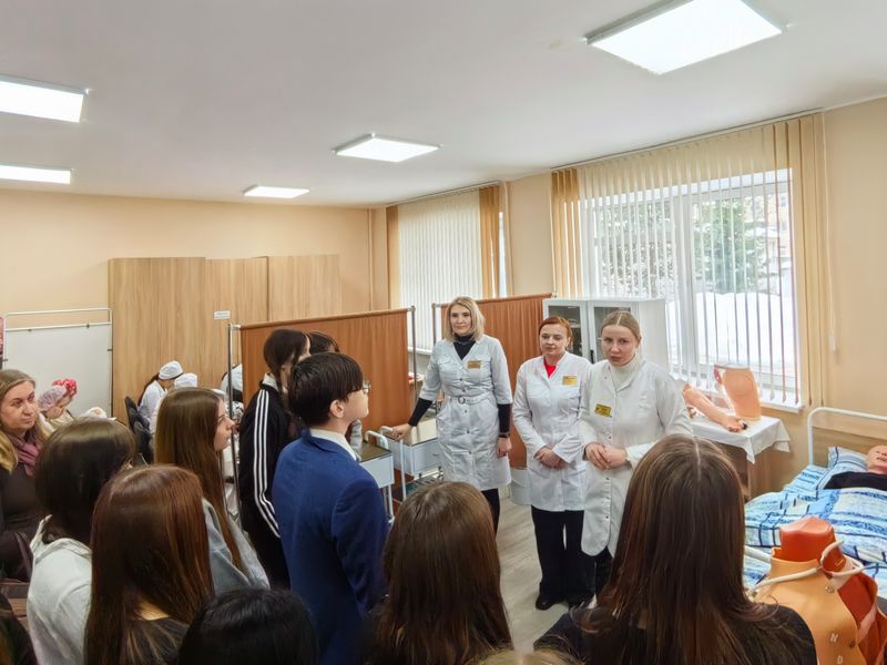 Экскурсия началась с осмотра учебного корпуса № 2. Ребята с интересом изучали современные лаборатории, посетили учебное занятие преподавателя Заика Елены Михайловны по предмету «Сестринское дело и манипуляционная техника». Для подростков это стало настоящим открытием: они увидели, что обучение медицине — это не только теория, но и постоянная практика с использованием передовых технологий.